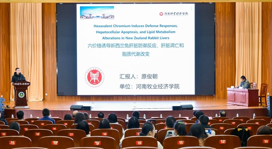 会上,动物医药学院原俊朝博士作“六价铬诱导新西兰兔肝脏的防御反应、肝细胞凋亡以及脂质代谢改变”专题报告,系统介绍了其研究团队在兽医病理生理与代谢研究领域的探索过程与创新成果,得到与会专家的广泛关注与高度认可,进一步提升了我校在兽医外科学领域的学术影响力。
