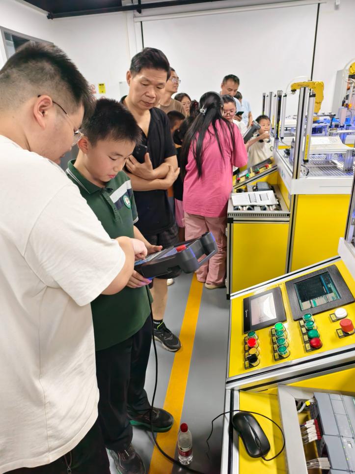 本次主题展分为机器人互动体验区和示教编程实验室体验区。在机器人互动体验区,小朋友们在该院机器人工程教研室主任李骞的带领下,参观了形态各异的机器人。机器狗灵活跳跃,无人机飞舞盘旋,六爪机器人稳健攀爬,舞蹈机器人翩翩起舞,赢得了孩子们的阵阵掌声和欢呼声。在专业老师的指导下,孩子们不仅近距离观察了机器人的工作原理,还亲手操控机器人,体验到了科技的魅力与乐趣。在示教编程实验室体验区,小朋友们观看了机械臂精准抓举、开启易拉罐等精彩演示,并纷纷围在操作台前,积极提问,认真学习。