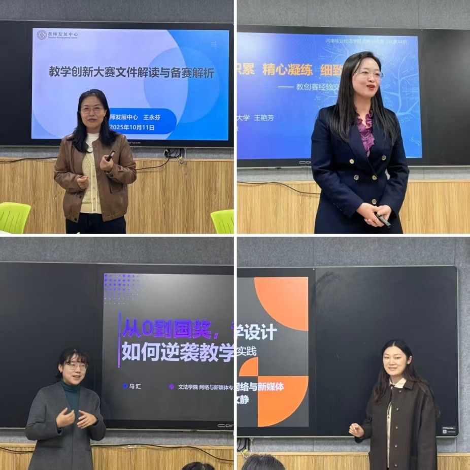 本次活动自9月份启动,历时近3个月,分三个阶段进行。分别聚焦教学创新大赛“要点、设计与材料准备”“评审指标体系内容”和“现场汇报备赛需求”,先后邀请国赛一等奖获奖教师、河南理工大学副教授王艳芳,我校教师发展中心主任王永芬以及我校国赛、省赛获奖教师开展系列专题讲座,深入解读教学创新大赛的备赛思路以及大赛的内在逻辑与评审指标,帮助教师快速厘清备赛逻辑、建立科学备赛认知,为教师备赛明确思路、提供指导。